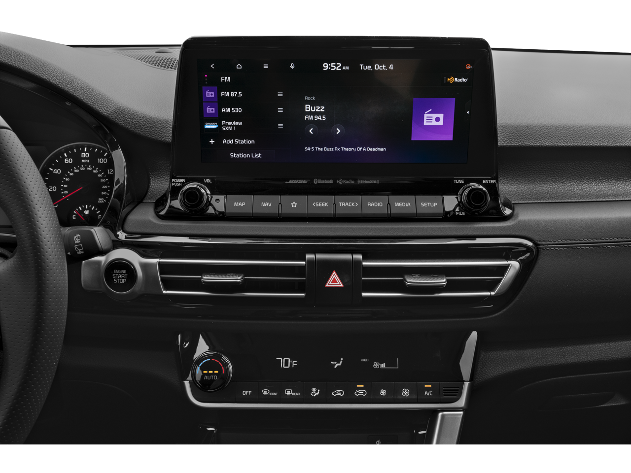 - Radio: AM/FM/MP3 Display Audio w/Navigation -inc: 10.25" touch screen, satellite radio, UVO telematics, Android Auto, Apple CarPlay, voice recognition and Bose premium sound system w/8 speakers